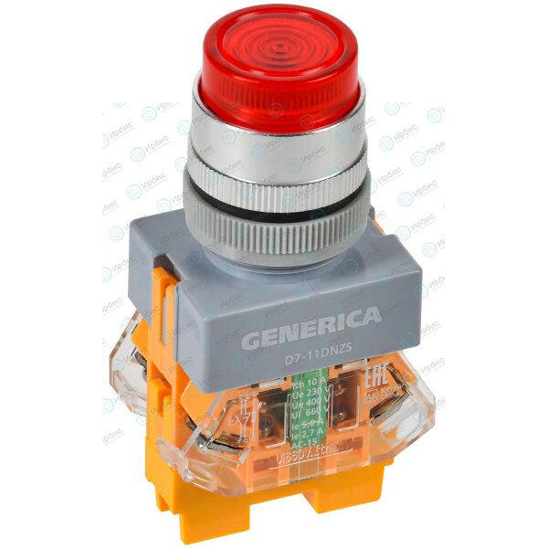 Кнопка управления D7-11DNZS d=22мм 1NC+1NO с подсветкой и фиксацией красная GENERICA