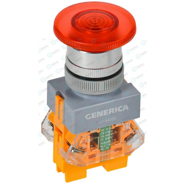 Кнопка управления D7-MDZS "Грибок" d=22мм 1NC+1NO с подсветкой и фиксацией красная GENERICA