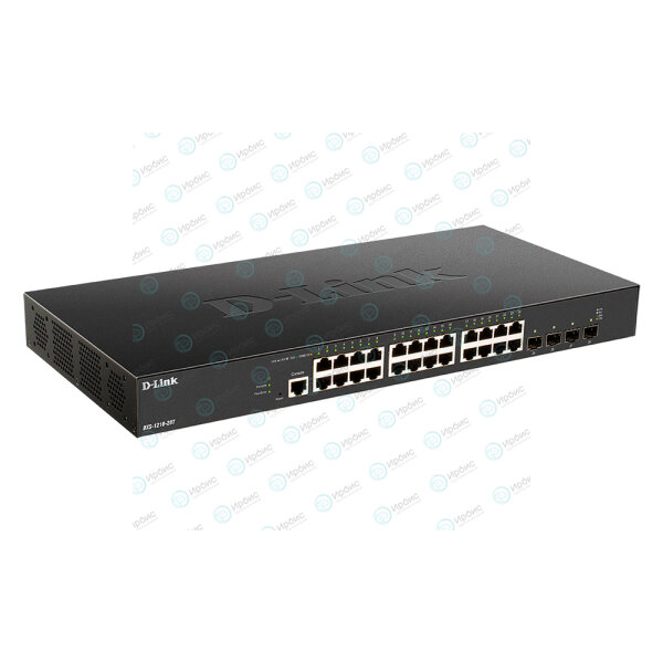 Коммутатор DXS-1210-28T, кабель питания, фиксатор для кабеля питания, консольный кабель с разъемом RJ-45, 4 резиновые ножки, 2 крепежных кронштейна для установки в 19-дюймовую стойку, комплект для монтажа, краткое руководство по установке