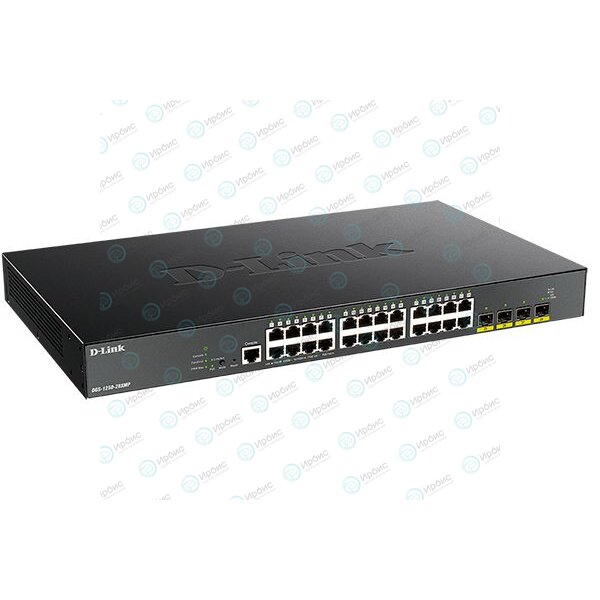 24 порта 10/100/1000Base-T с поддержкой PoE, 4 порта 10GBase-X SFP+, Консольный порт с разъемом RJ-45