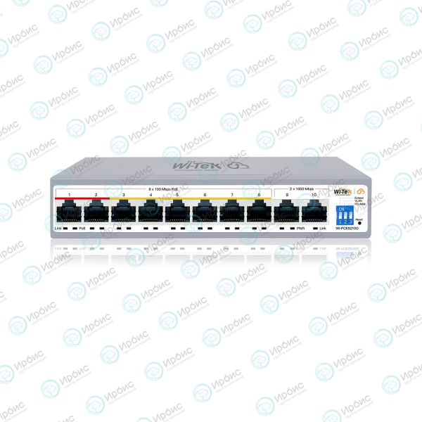 8 портов 10/100 Мбит/c PoE RJ45 (Downlink); 2 порта 10/100/1000 Мбит/c RJ45 (Uplink)