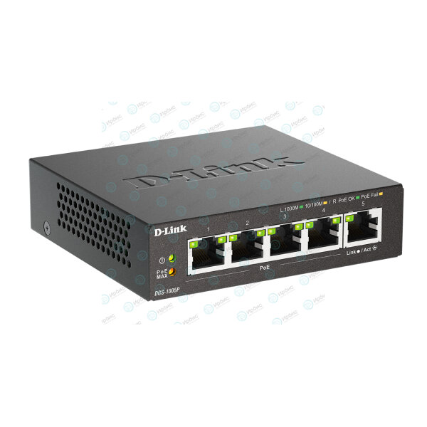 Коммутатор DGS-1005P, адаптер питания, сетевой кабель питания, комплект для монтажа на стену, 4 резиновые ножки, краткая инструкция по подключению