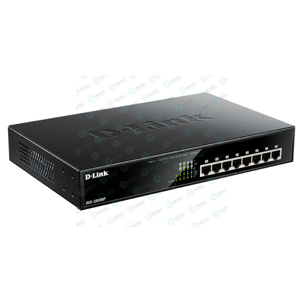 Коммутатор DGS-1008MP, кабель питания, Фиксатор для кабеля питания, 2 крепежных кронштейна для установки в 19-дюймовую стойку, 4 резиновые ножки, комплект для монтажа, краткое руководство по установке