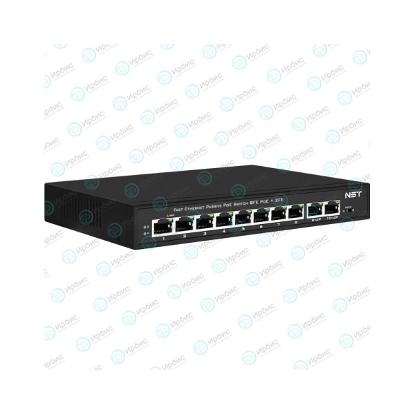 Порты: 8 х FE (10/100 Base-T, 52V 4,5(+) 7,8(–)) совместимы с PoE (IEEE 802.3af/at), 2 x FE (10/100 Base-T) Uplink