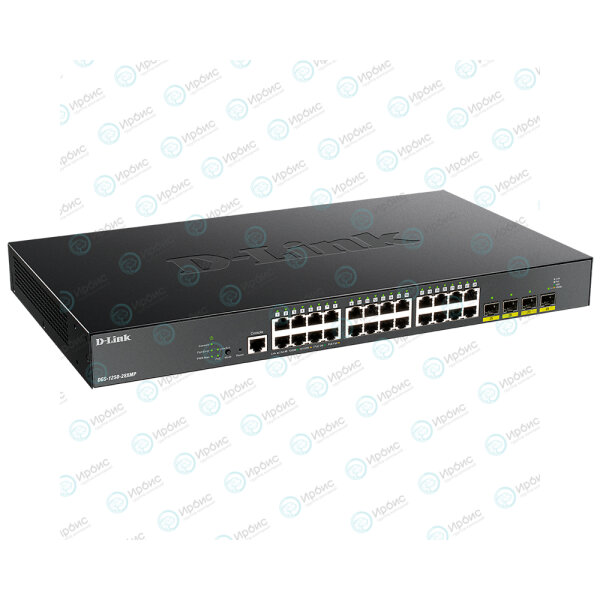 24 порта 10/100/1000Base-T с поддержкой PoE, 4 порта 10GBase-X SFP+, Консольный порт с разъемом RJ-45
