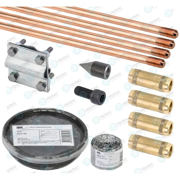 Комплект заземления товарного знака IEK используется для организации заземляющего устройства жилых объектов, объектов энергетического и промышленного комплексов, объектов связи. Данный комплект монтируется на глубину 6 метров путём последовательного соединения и заглубления стержней с помощью перфоратора или кувалды.