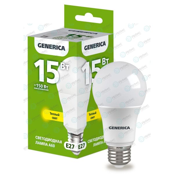 Лампа светодиодная A60 груша 15Вт 230В 3000К E27 GENERICA
