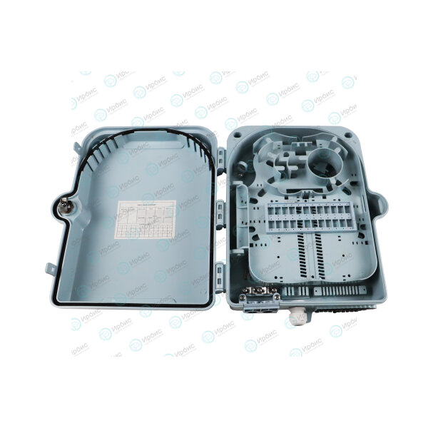 Муфта-кросс имеет два герметичных ввода с металлическими хомутами для ОВ кабеля до 14мм, и 24+1 выхода для дроп-кабеля FTTH.