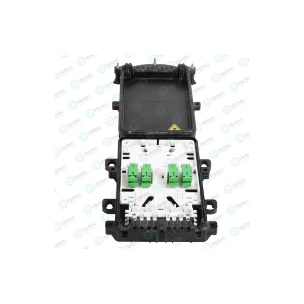 Муфта представляет собой малогабаритный герметичный контейнер прямоугольной формы. Внутри контейнера установлена съёмная монтажная панель (вставка), с тыльной стороны которой вмонтированы два ложемента для размещения сростков ОВ, защищенных гильзами КДЗС 4525, а на лицевой стороне панели находятся гнёзда для установки адаптеров типа SC. На лицевой части монтажной панели расположен ложемент типа Л2-СП, на который возможно установить разветвители в мини-корпусах с волокнами длиной 1 метр в буферном покрытии 900 мкм. Предусмотрена установка одного разветвителя РО-1х8-PLC-SM/0,9-1,0 м-SC/APC или двух разветвителей РО-1х4 -PLC -SM/0,9-1,0 м-SC/APС