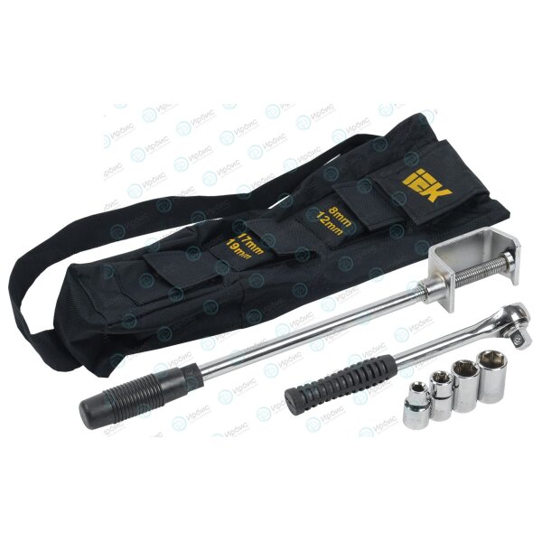 Набор состоит из струбцины, реверсивного трещоточного ключа и набора сменных головок. Струбцина применяется для фиксации изделий со срывными болтами. Возможно использование струбцины для разворота и ориентирования жил кабеля. Реверсивный трещоточный ключ и набор сменных головок позволяют осуществить монтаж с минимальными усилиями.