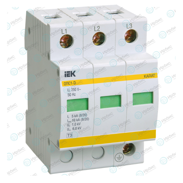 Ограничитель импульсных перенапряжений ОПС1-D 3Р In=5kA Un=230B Im=10kA, IEK MOP20-3-D