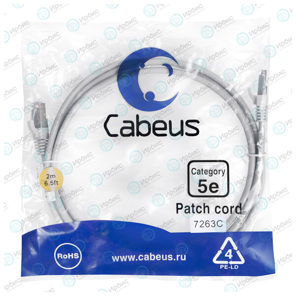Патч-корд 4 пары, 2хRJ45, 2м, Кат.5е, FTP, серый, PVC, Cabeus PC-FTP-RJ45-Cat.5e-2m