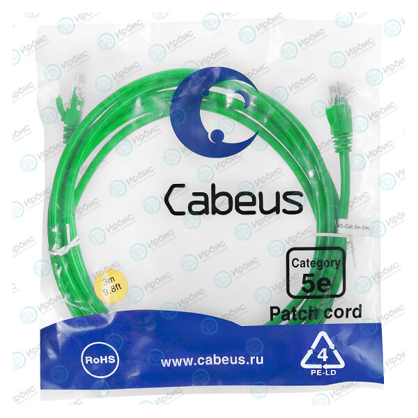 Патч-корд 4 пары, 2хRJ45, 3м, Кат.5e, UTP, зеленый, PVC, Cabeus PC-UTP-RJ45-Cat.5e-3m-GN