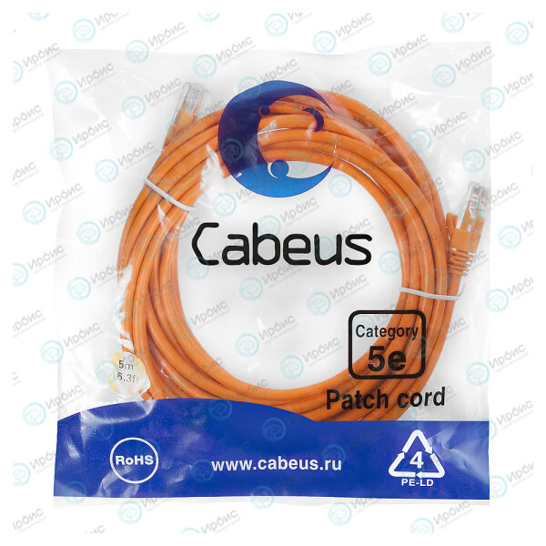 Патч-корд 4 пары, 2хRJ45, 5м, Кат.5e, UTP, оранжевый, PVC, Cabeus PC-UTP-RJ45-Cat.5e-5m-OR
