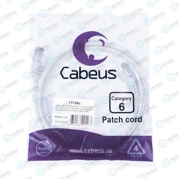 Патч-корд 4 пары, 2хRJ45, 1.5м, Кат.6, UTP, белый, LSZH, Cabeus PC-UTP-RJ45-Cat.6-1.5m-WH-LSZH