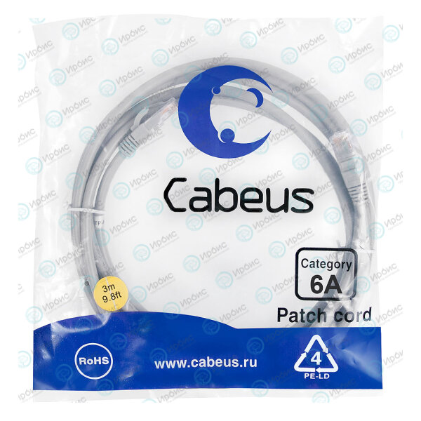 Патч-корд 4 пары, 2xRJ45, 3м, Кат.6а, UTP, серый, LSZH, Cabeus PC-UTP-RJ45-Cat.6a-3m-LSZH