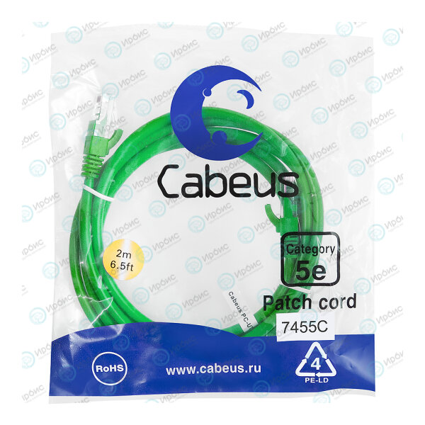 Патч-корд 4 пары, 2хRJ45, 2м, Кат.5e, UTP, зеленый, LSZH, Cabeus PC-UTP-RJ45-Cat.5e-2m-GN-LSZH