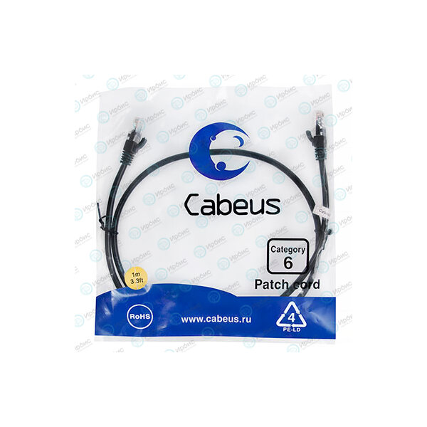 Патч-корд 4 пары, 2хRJ45, 1м, Кат.6, UTP, черный, PVC, Cabeus PC-UTP-RJ45-Cat.6-1m-BK