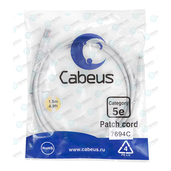 Патч-корд 4 пары, 2хRJ45, 1.5м, Кат.5e, UTP, белый, LSZH, Cabeus PC-UTP-RJ45-Cat.5e-1.5m-WH-LSZH