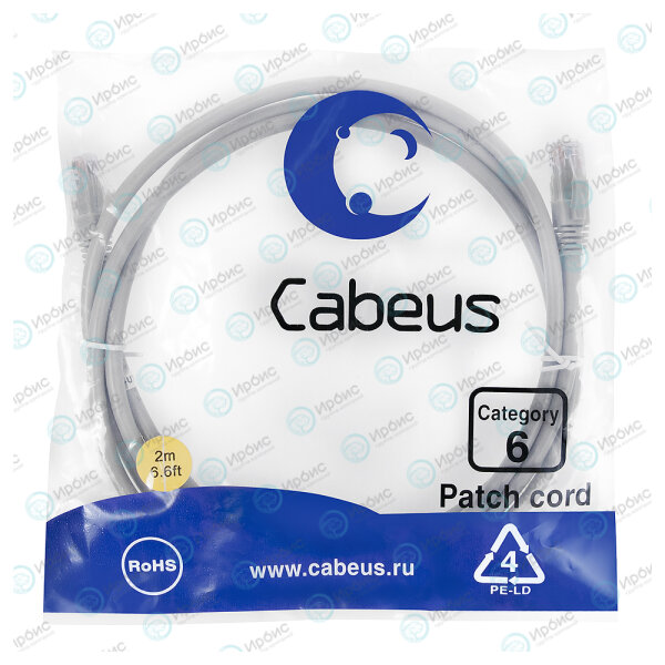 Патч-корд 4 пары, 2хRJ45, 2м, Кат.6, UTP, серый, PVC, Cabeus PC-UTP-RJ45-Cat.6-2m