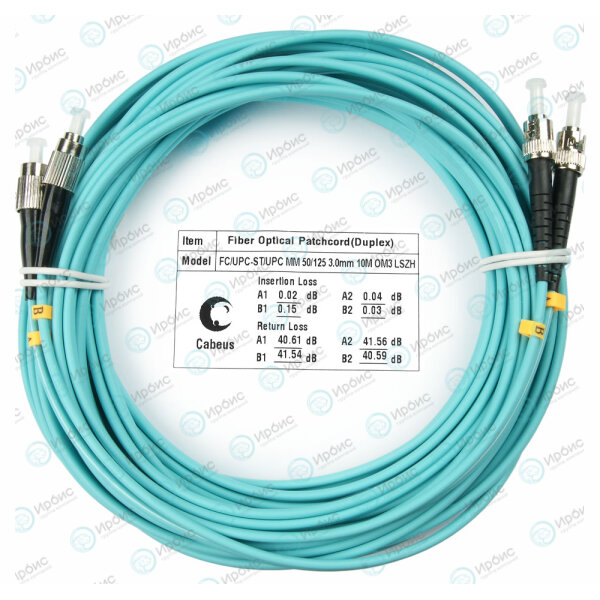 Шнур оптический FC/UPC-ST/UPC, МM, 50/125, OM3, 15м, Duplex, бирюз., Cabeus FOP-50-FC-ST-15m