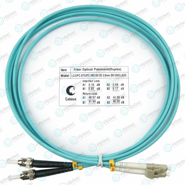 Шнур оптический LC/UPC-ST/UPC, МM, 50/125, OM3, 1.5м, Duplex, бирюз., Cabeus FOP-50-LC-ST-1,5m