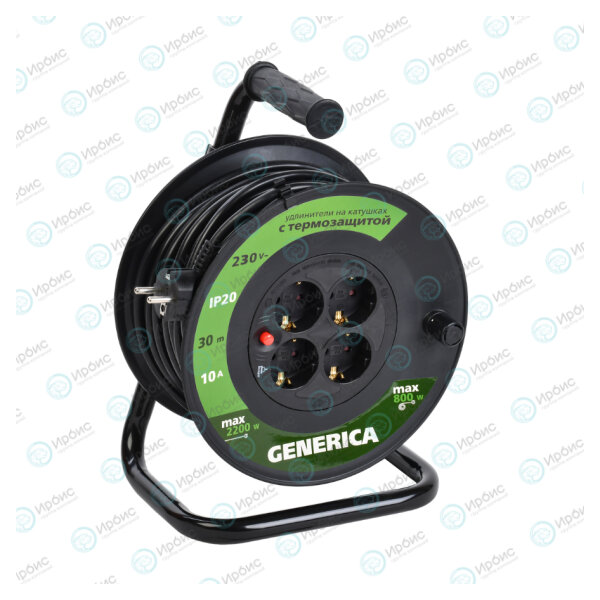 Удлинитель на катушке с т/з, 4 места, 2P+PE/30м, 3х1,0мм2, GENERICA WKP10-10-04-30-G