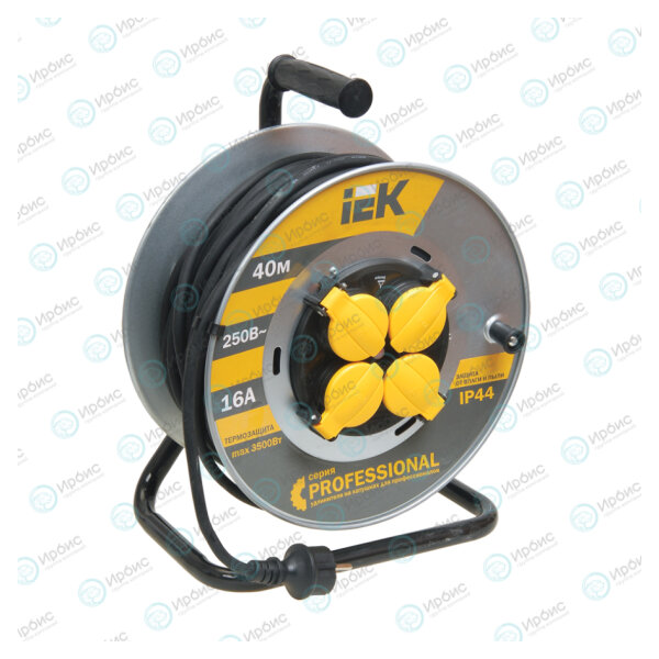 Удлинитель на катушке с т/з, 4 места, 2Р+PЕ/40м, 3х1,5мм2, IP44, IEK WKP16-16-04-40-44