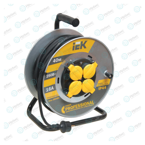 Удлинитель на катушке с т/з, 4 места, 2Р+PЕ/40м, 3х2,5мм2, IP44, IEK WKP17-16-04-40-44