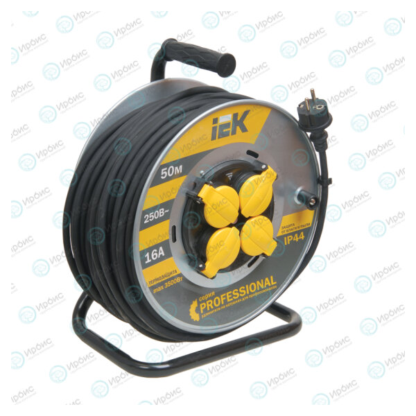 Удлинитель на катушке с т/з, 4 места, 2Р+PЕ/50м, 3х1,5мм2, IP44, IEK WKP16-16-04-50-44