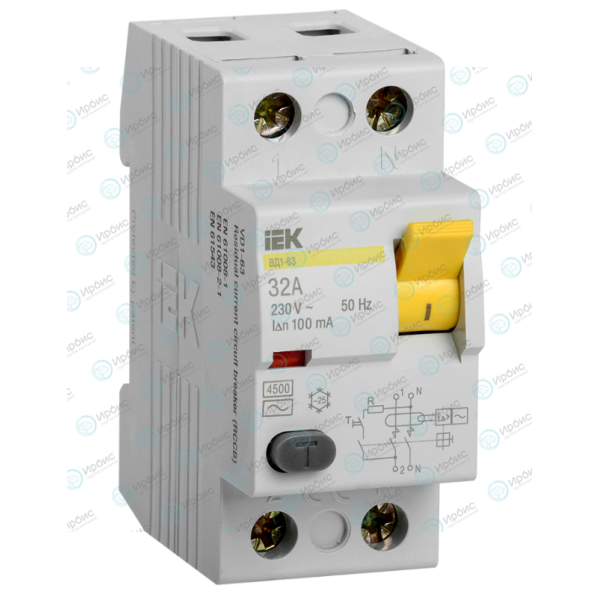 Выключатель дифференциальный ВД1-63 2Р 32А 100мА, IEK MDV10-2-032-100