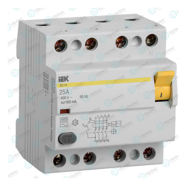 Выключатель дифференциальный ВД1-63 4Р 25А 100мА, IEK MDV10-4-025-100