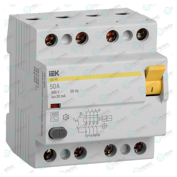 Выключатель дифференциальный ВД1-63 4Р 50А 30мА, IEK MDV10-4-050-030