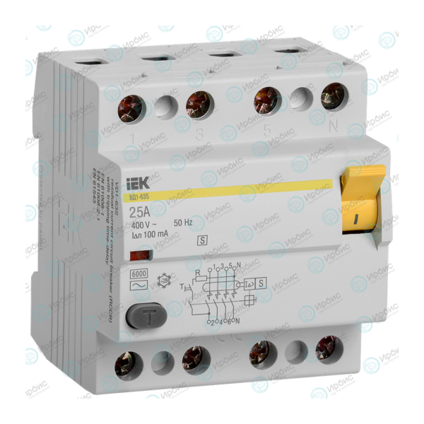 Выключатель дифференциальный ВД1-63S 4Р 25А 100мА, IEK MDV12-4-025-100